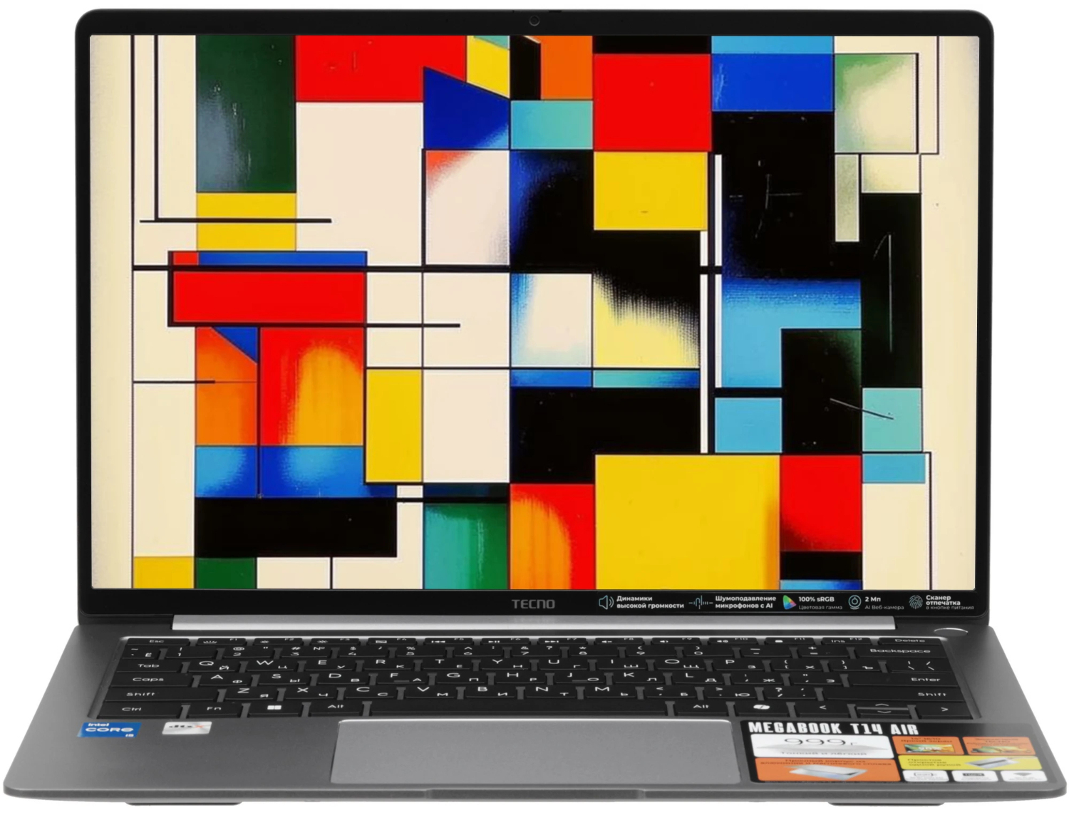Tecno Megabook T14RA Air создан как лёгкий и аккуратный рабочий инструмент. Корпус тонкий, минималистичный, с ровными линиями и аккуратными рамками вокруг экрана. Ноутбук ощущается очень лёгким в руках, поэтому его удобно носить с собой каждый день. Конструкция собрана жёстко, без лишнего прогиба, а форм-фактор позволяет комфортно пользоваться устройством как за столом, так и в дороге.
