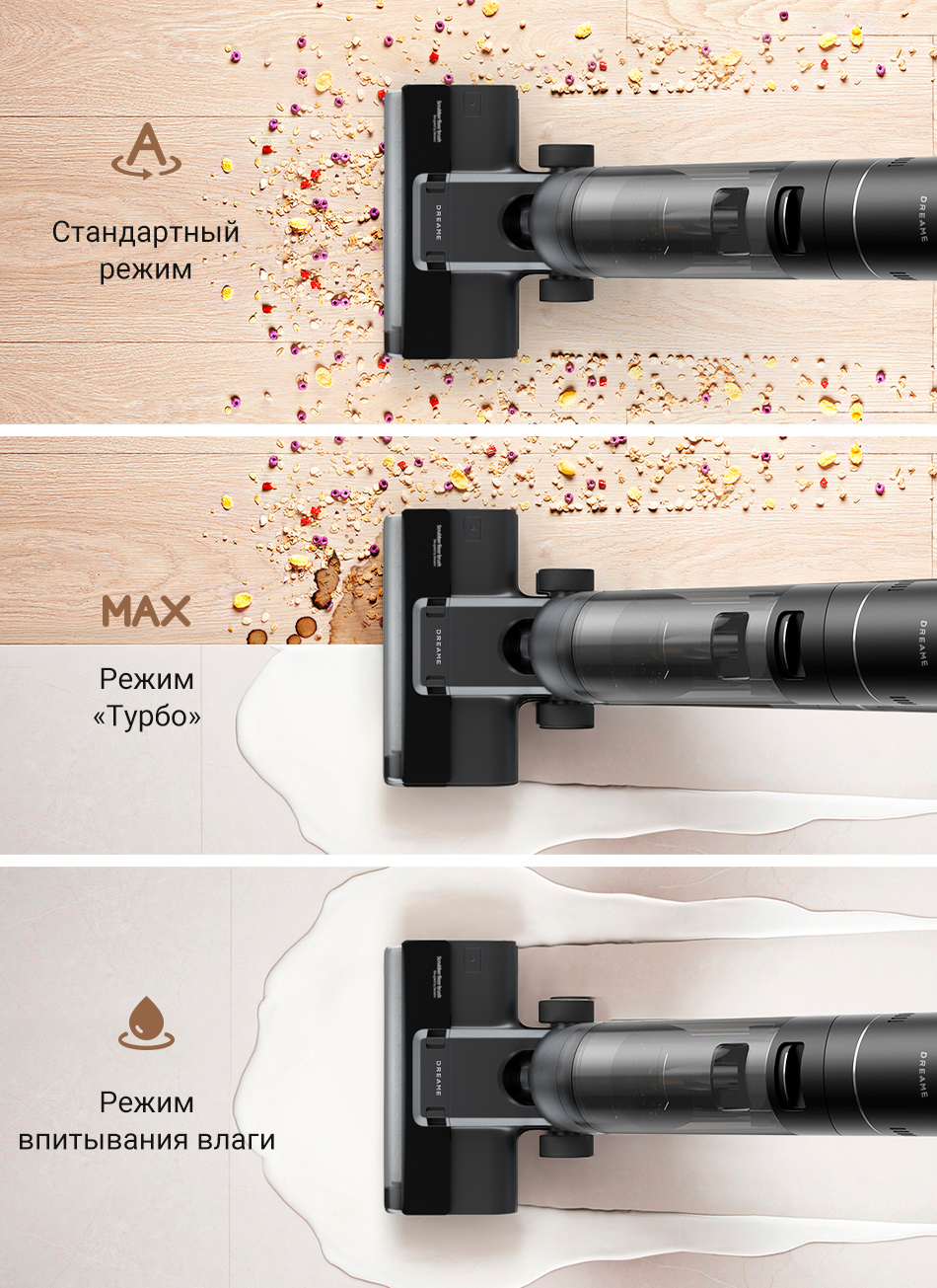 Для ежедневной уборки предусмотрен стандартный режим, для въевшихся загрязнений - режим «Турбо». Вы сможете легко удалять как сухие, так и влажные загрязнения. А режим впитывания влаги можно использовать для уборки без мытья пола.