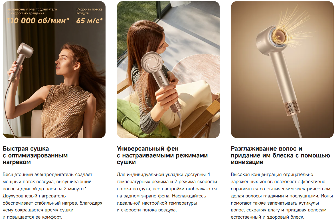 Встроенный генератор ионов помогает снизить статическое электричество, делая волосы более гладкими и послушными. Это особенно заметно при ежедневной сушке и укладке, когда важно сохранить аккуратный внешний вид причёски.