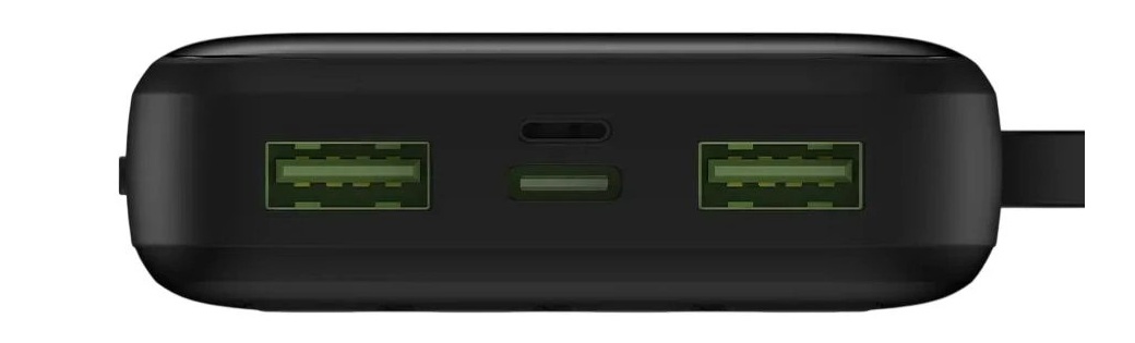 Помимо встроенных кабелей, модель предлагает набор разъемов, обеспечивающих гибкость подключения. На корпусе находятся USB Type-C, который может работать и как вход, и как выход, разъём Lightning на вход и два USB-A для подключения нескольких устройств. Такой набор делает пауэрбанк универсальным и удобным для зарядки смартфонов, наушников, колонок, фотоаппаратов и других гаджетов.