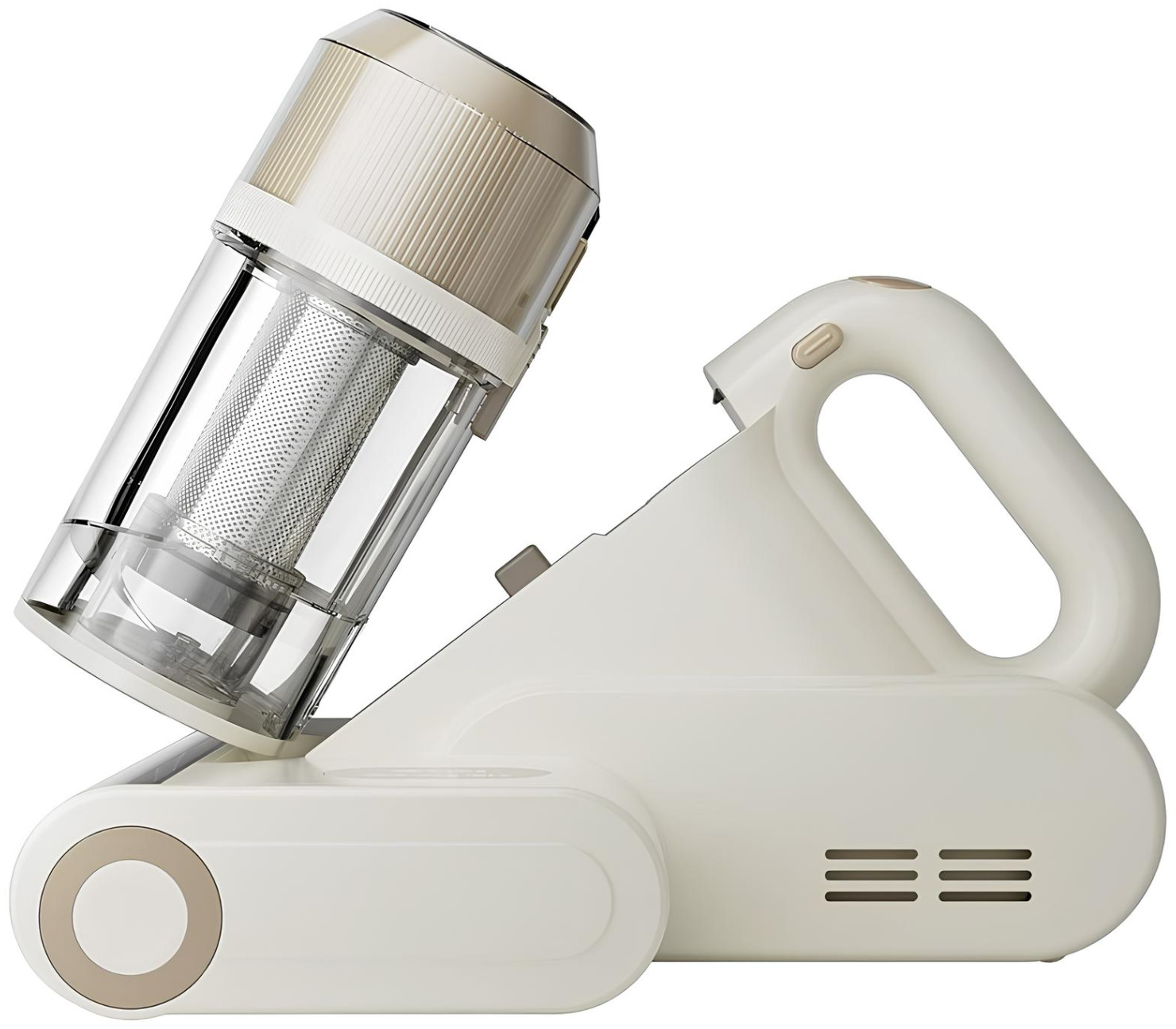 Dreame S10 выполнен в компактном корпусе белого цвета с коричневыми элементами, что делает устройство аккуратным и визуально приятным. Габариты 265×230×220 мм подходят для работы по матрасам, диванам и мягкой мебели, а вес 1.8 кг позволяет уверенно вести пылесос по ткани без лишних усилий. Корпус из прочного пластика устойчив к износу и рассчитан на регулярное использование.