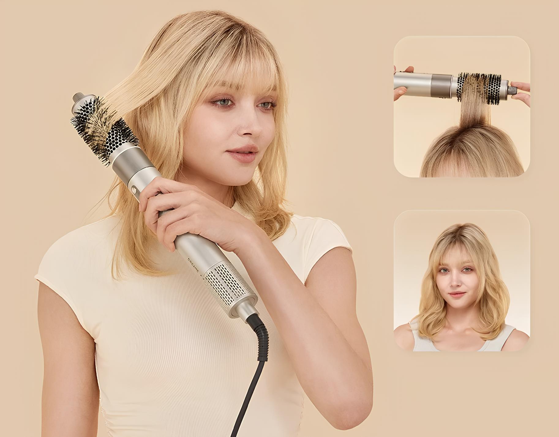 Насадка для завивки направляет воздух изнутри наружу, оставляя зазор для бережной укладки волос. Благодаря удобным настройкам и автоматическому наматыванию она позволяет без труда создать упругие локоны.